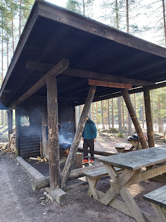 Päätettiin kuitenkin lähteä metsäretkelle ja pakattiin makkaraa ja kahvia reppuun evääksi. Uutisoinnista päätellen kaikki lähitienoiden luontopolut ym, ovat olleet täynnä porukkaa, joten käytettiin hetki aikaa siihen, että etsittiin netistä jokin sopiva paikka, joka olisi vähän kauempana pääkaupunkiseudusta, mutta kuitenkin siten, että sinne ei olisi ihan hirveän pitkä matka. Päädyimme siis Salmen ulkoilualueelle ja sepä olikin hyvä ratkaisu, siellä sai olla aivan rauhassa. Muutama koiranulkoiluttaja oli ja grillipaikoille joihin pääsi autolla, oli lapsiperheitä. Mehän tietysti kierrettiin ne kaukaa.